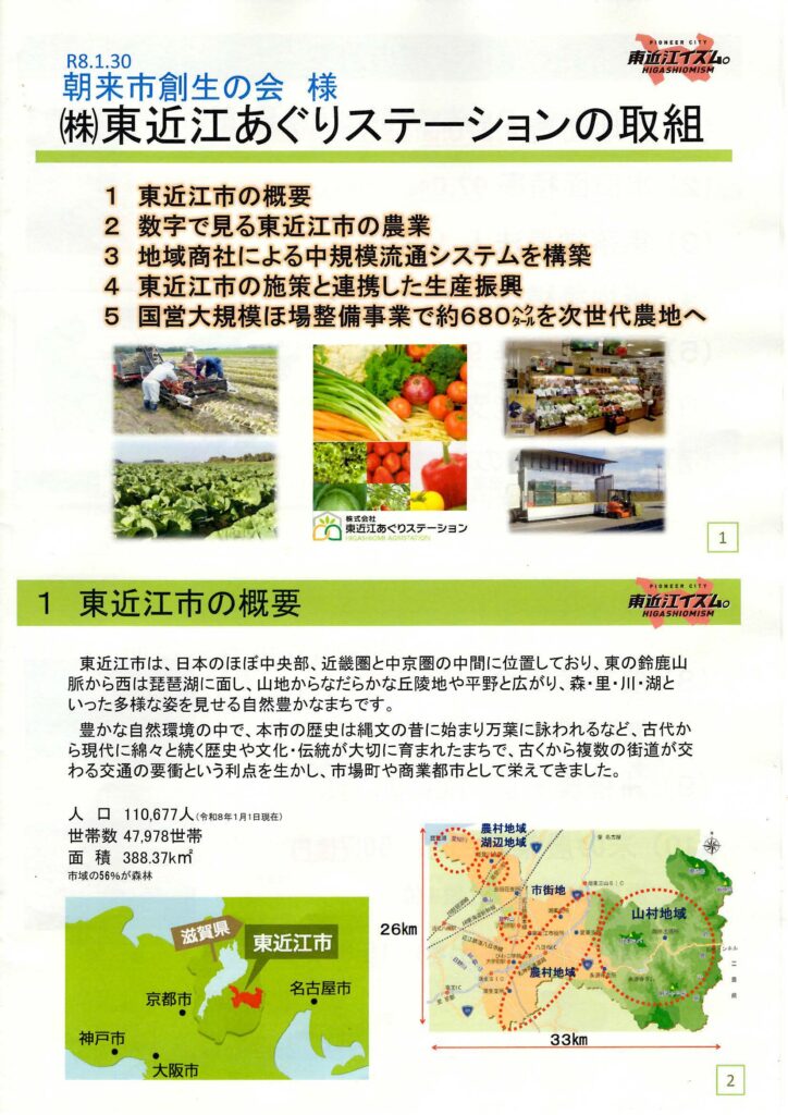 本視察では、地域商社を核とした中規模流通の構築、高収益作物への政策誘導、行政が商流に関与する体制づくりにおいて先進的な取組を行っている東近江市を訪問し、制度設計だけでなく、実務・運営の実態、成功と課題の両面を把握することを目的とした。